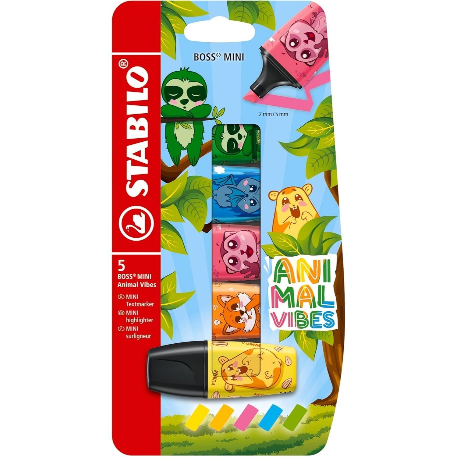 - Le classique STABILO Boss Original au format mini (5 surligneurs), imprimé avec de jolis motifs d'animaux